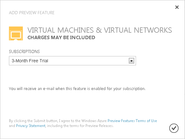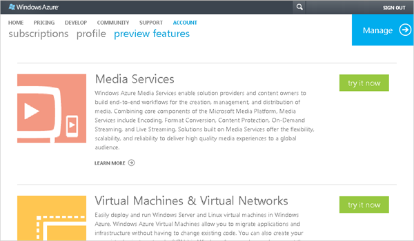 You will need to sign up for the Windows Azure Virtual Machines preview feature in order to create a virtual machine. You can also sign up for a free trial account if you do not have a Windows Azure account.