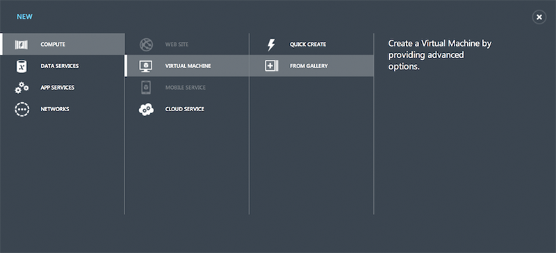 2. In the Management Portal, at the bottom left of the web page, click “+New”, click “Virtual Machine”, and then click “From Gallery”.