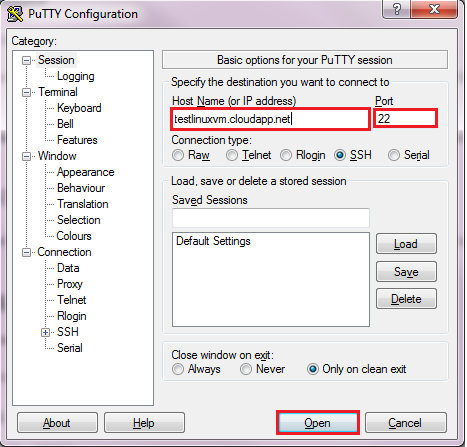 2. Enter the SSH DETAILS as found on the Node’s Dashboard, i.e., “testlinuxvm.cloudapp.net” for the Host Name and “22” for the Port.