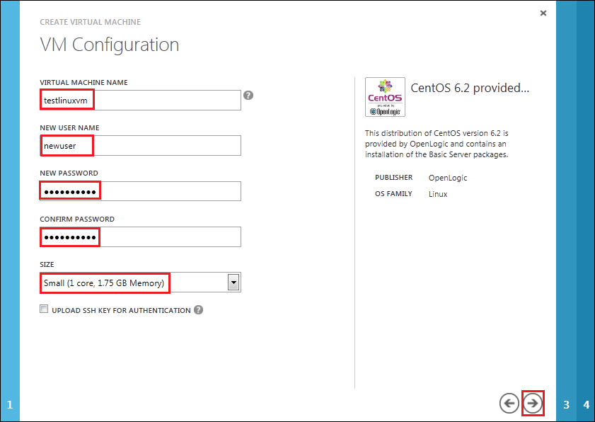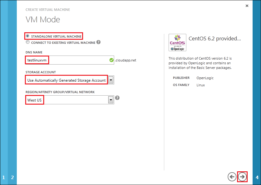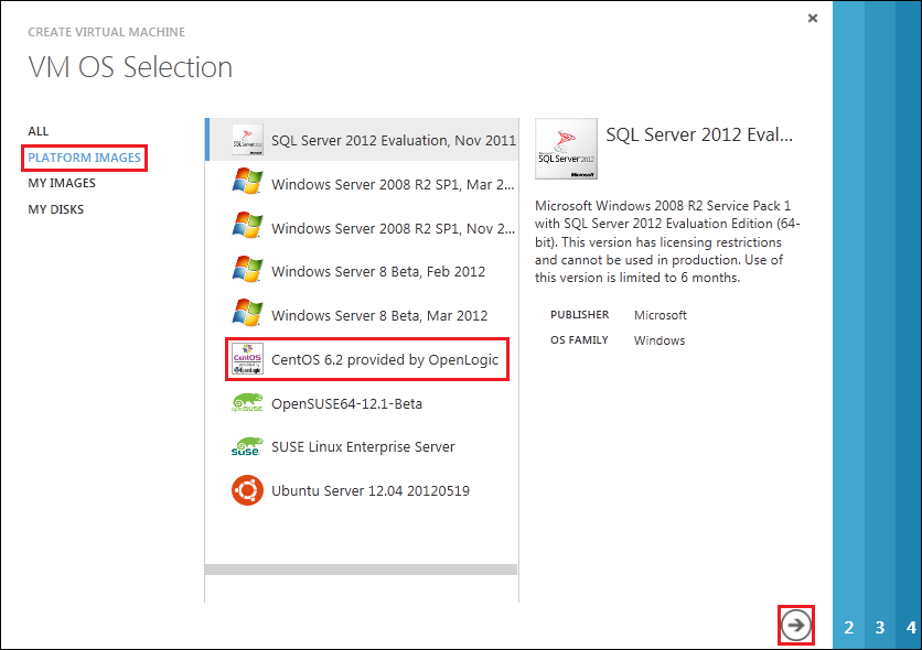 3. Select a CentOS virtual machine image from “Platform Images”, and then click the next arrow at the bottom right of the page.
