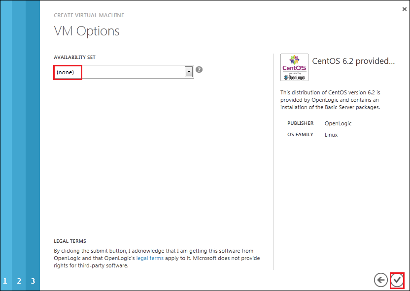 6. On the VM Options page, select “(none)” in the “Availability Set” box. Click the check mark to continue.
