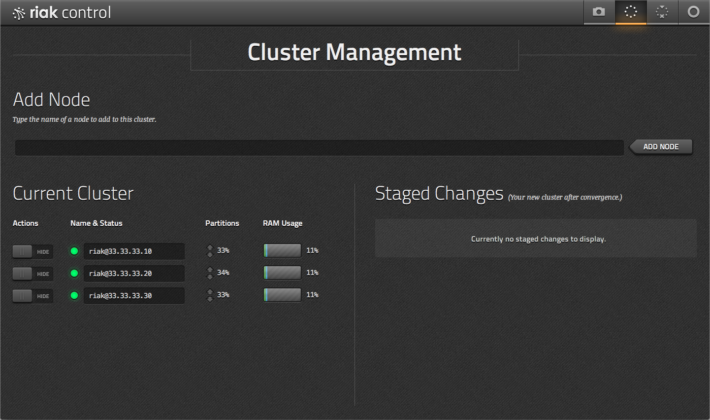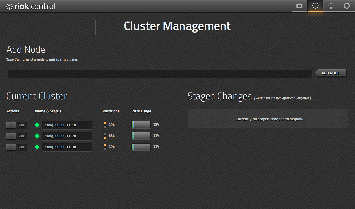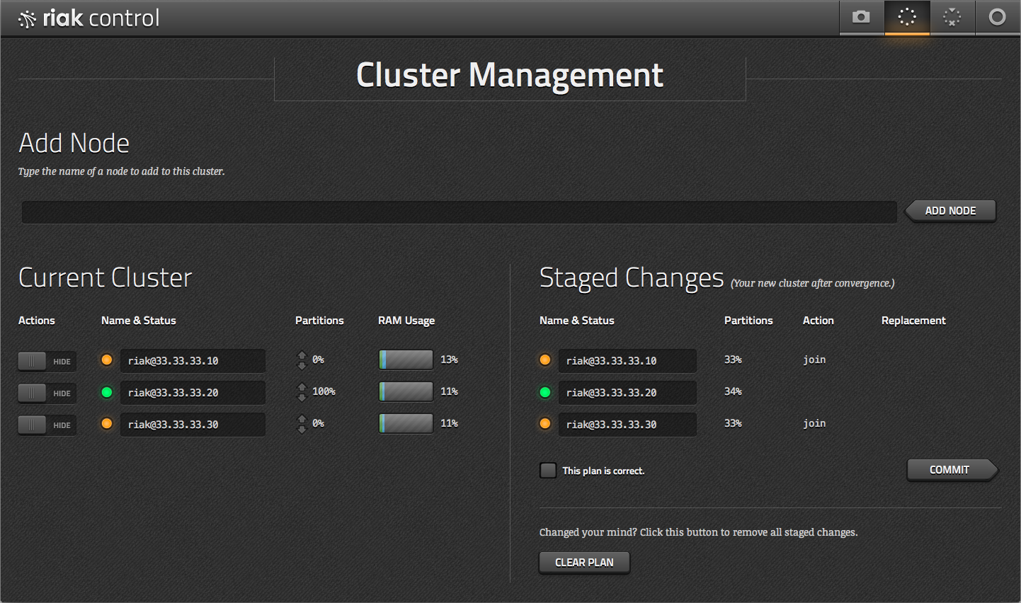 On this page, you can see all of the nodes in your cluster, along with their status, the percentage of the ring owned by that node, and memory consumption. You can also stage and commit changes to the cluster, such as adding, removing, and marking nodes as down.