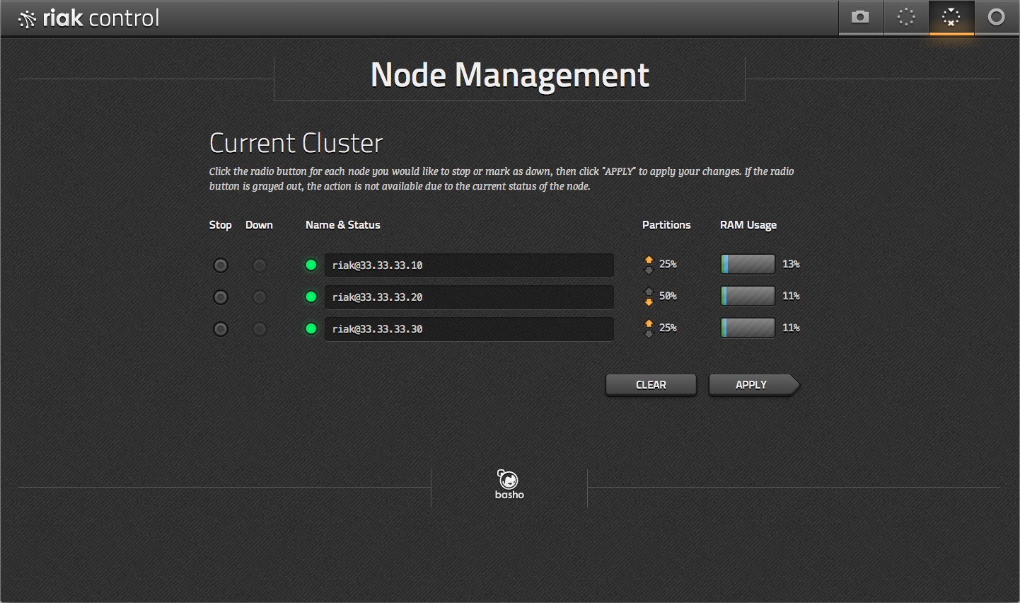 Riak Control is a web-based administrative console for inspecting and manipulating Riak clusters.